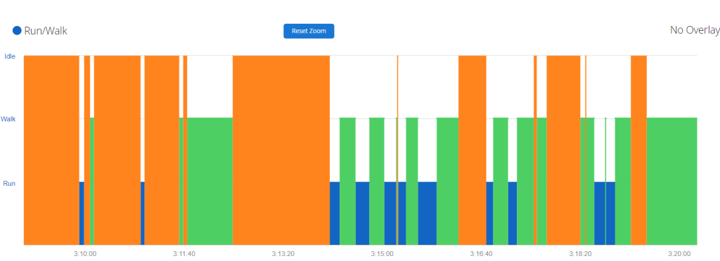 Eventually I just started trying to take it 30 steps at a time. Mostly couldn’t even make it that many before I felt I needed a break. Bit by bit though I made my way up the hill and eventually the slope lessened a bit and I was walking to the finish line to receive my finisher’s medal. I made it back to the nearby shelter where the aid station was and got some Tailwind (electrolyte drink) and sat down and started to recover. I don’t believe I was the last finisher (33 of us did the half-marathon, they had a 5k and a 10k as well) but I wouldn’t be surprised if I was the most destroyed at the end. Below is my run/walk/idle chart for the final excruciating 12 minutes it took me to cover a quarter mile. No, I didn’t run at all it’s just categorizing the pace that way for some reason.