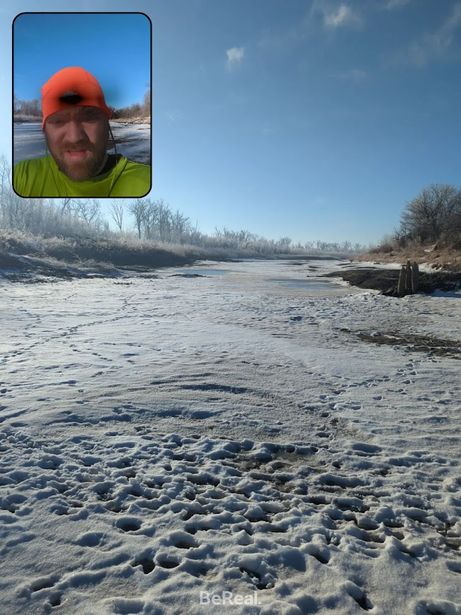 Couple of weeks ago… Water levels were low enough this offshoot of the Missouri River was pretty much dry other than the snow. I got to run a bit in the river bed!